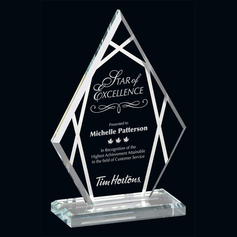 The Diamond Radiance Glass Trophy is an emblem of success and achievement, serving as a masterpiece of recognition. Its diamond-shaped design is perfect for celebrating outstanding performances and milestones, making it ideal for corporate awards, personal achievements, and competitive recognitions. The trophy is crafted with a focus on elegance and brilliance, reflecting the pinnacle of accomplishments in any field. Its radiant finish and distinctive shape make it a sought-after choice for a variety of honours, including business achievements, scholastic awards, and sports accolades. This Glass Trophy stands as a mark of distinction and excellence in any arena.