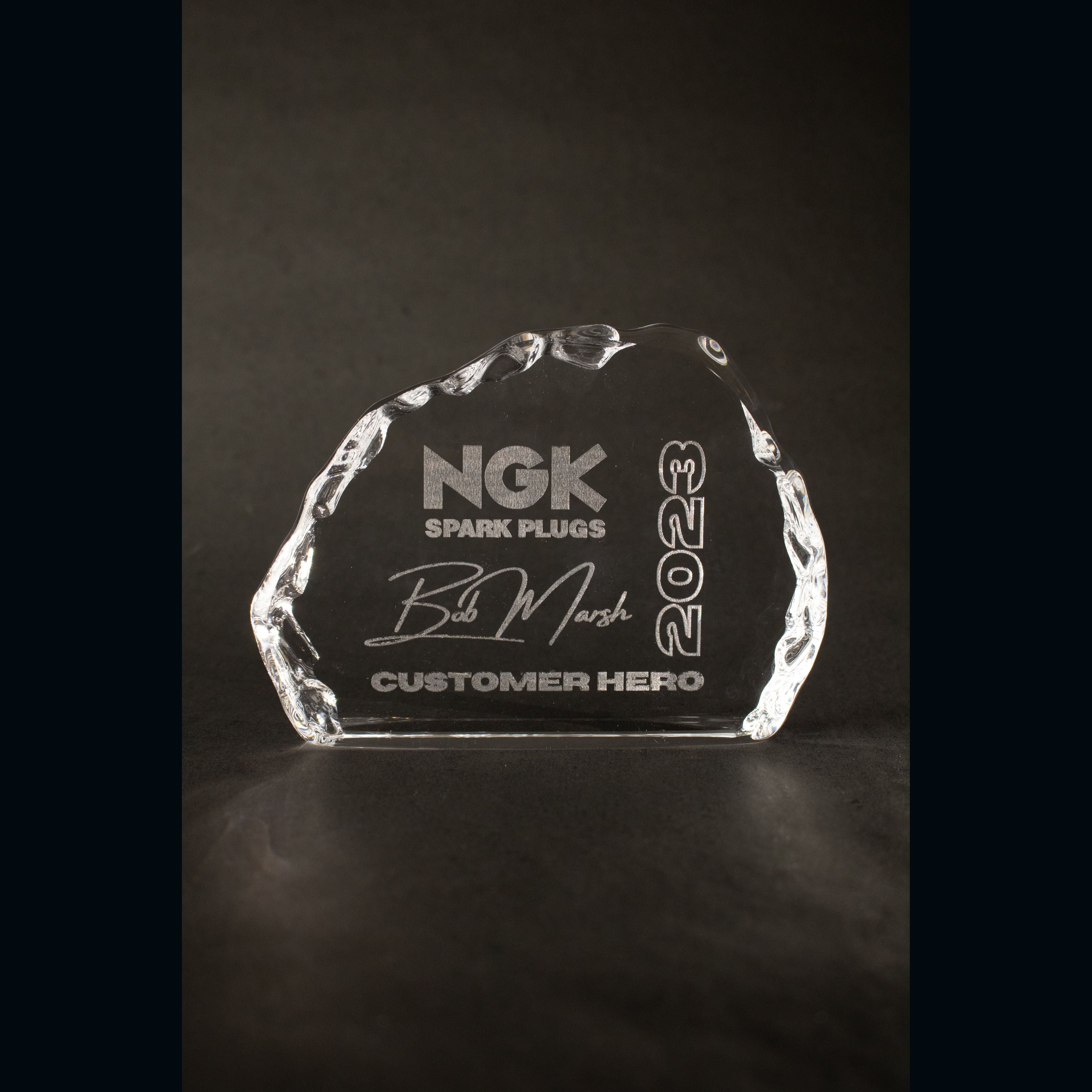 This glass award showcases a horizontal orientation, exuding a sense of stability and strength.