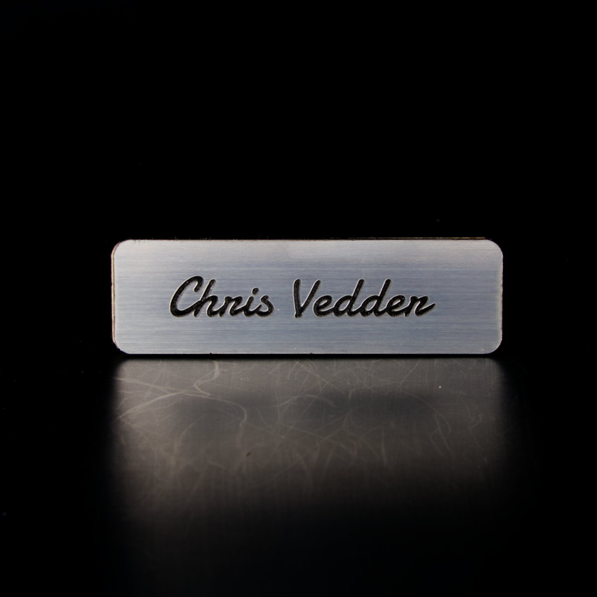 Silver name tag with black engraved surface and magnet to attach to clothing.